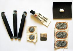 Road vehicles often include basic tools and spare parts which commonly fail. A bicycle repair kit, for example, normally contains tools as well as patches and glue to repair a punctured tire. Other kits that include patches and glue are used to fix holes in fabric items such as inflatable boats and tents.