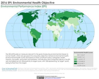 Environmental health indicator (2016). It consists of three categories: health impacts, air quality, and water and sanitation. The health impacts category includes the environmental risk exposure indicator.