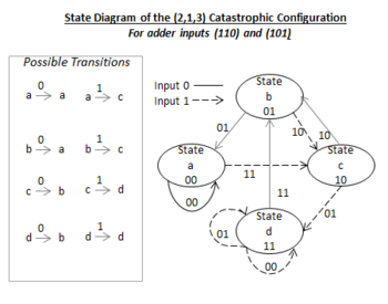 - Catastrophic configurations exist too. These produce very high errors in their own right, or like rate 1/2 configuration (6,5), cannot be implemented at all. Such a problem can occur when two possible outcomes are likely for a given transition. See Figure 9 for the state diagram of the (6,5) configuration. The subject is covered well elsewhere but requires an understanding of polynomial expressions and the identification of common factors within them for a complete understanding.