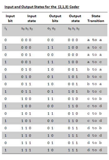 Every line of data in the table can be interpreted in a similar way. The table, in addition to explaining all possible coder behaviours is used in laying out the corresponding decoder trellis. A graphical layout of the same data is provided by the state diagram of Figure 2.