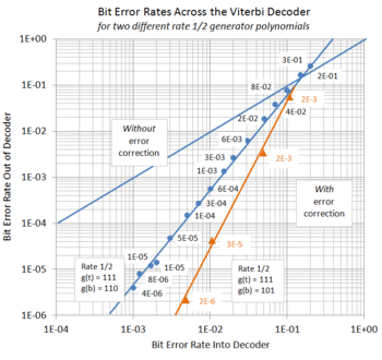 - Software can simulate the error correction of a system. One such program was used to simulate the coding described on this page. See Viterbi Simulator in VBA for such a VBA code module. The general arrangement involves the generation of random input traffic for the coder program. Then, instead of connecting the coder output to the input of the decoder program, the bit stream is first given a prescribed proportion of errors. By monitoring the decoder's input error rate and the resulting output error rate in the decoded message, some idea of the improvement afforded by such a system can be obtained. Figure 8 shows the data for two sets of such measurements; one for the example (111,110) configuration, and another for the (111,101) configuration. The results were found using relatively small samples, that is, one million bits of message traffic for each data point, however, the improvement in performance for lowered error rates is clearly demonstrated. Concentrating on our example, the (111,110) configuration, the results in blue, we note:
