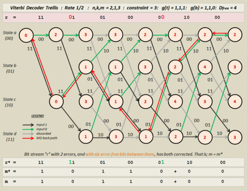 - Stream r*, near the bottom of the diagram is the trellis-modified version of r. The pairs match the output values on the edges of the back track. These can differ from r even when the message output has been corrected.
