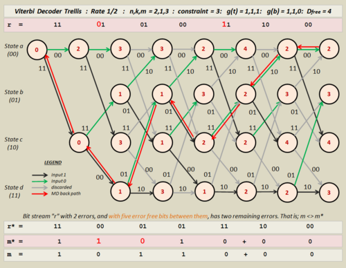 - The best estimate for the intended input, not necessarily the one that was received by the decoder in r, can then be found by noting certain characteristics of the back-path. These include the output values along the travelled lines (or edges), and whether the component part lies on an outgoing upper or lower branch, (green or black).