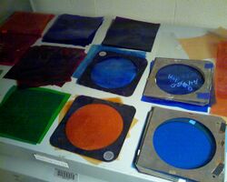 A color gel or color filter (Commonwealth spelling: colour gel or colour filter), also known as lighting gel or simply gel, is a transparent colored material that is used in theater, event production, photography, videography and cinematography to color light and for color correction.[1] Modern gels are thin sheets of polycarbonate, polyester or other heat-resistant plastics,[2] placed in front of a lighting fixture in the path of the beam.