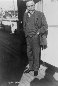 Von Jagow further argued that Lusitania had on previous voyages carried munitions and Allied troops.[84] Wilson continued to insist the German government apologise for the sinking, compensate U.S. victims, and promise to avoid any similar occurrence in the future.[85] The British were disappointed with Wilson over his failure to pursue more drastic actions. Secretary of State William Jennings Bryan advised President Wilson that "ships carrying contraband should be prohibited from carrying passengers ... [I]t would be like putting women and children in front of an army."[86] Bryan later resigned because he felt the Wilson administration was being biased in ignoring British contraventions of international law, and that Wilson was leading the U.S. into the war.[87]