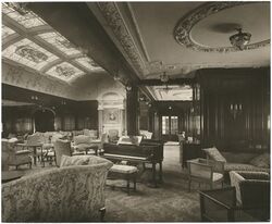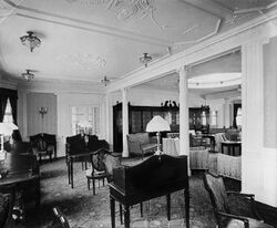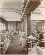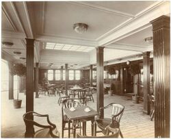 All other first-class public rooms were situated on the boat deck and comprised a lounge, reading and writing room, smoking room and veranda café. The last was an innovation on a Cunard liner and, in warm weather, one side of the café could be opened up to give the impression of sitting outdoors. This would have been a rarely used feature given the often inclement weather of the North Atlantic.[23]