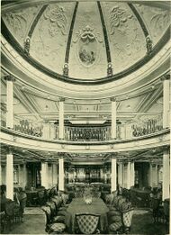 When Lusitania was fully booked in third class, the smoking and ladies room could easily be converted into overflow dining rooms for added convenience. Meals were eaten at long tables with swivel chairs and there were two sittings for meals. A piano was provided for passenger use. What greatly appealed to immigrants and lower class travellers was that instead of being confined to open berth dormitories, aboard Lusitania was a honeycomb of two, four, six and eight berth cabins allotted to third-class passengers on the main and lower decks.[27]