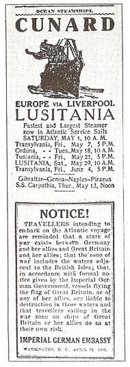 Travellers intending to embark on the Atlantic voyage are reminded that a state of war exists between Germany and her allies and Great Britain and her allies; that the zone of war includes the waters adjacent to the British Isles; that, in accordance with formal notice given by the Imperial German Government, vessels flying the flag of Great Britain, or any of her allies, are liable to destruction in those waters and that travellers sailing in the war zone on the ships of Great Britain or her allies do so at their own risk.