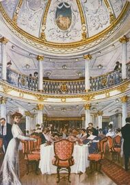 Noted as being the prime breadwinner for trans-Atlantic shipping lines, third class aboard Lusitania was praised for the improvement in travel conditions it provided to emigrant passengers; Lusitania proved to be a quite popular ship for immigrants.[26] In the days before Lusitania and even still during the years in which Lusitania was in service, third-class accommodation consisted of large open spaces where hundreds of people would share open berths and hastily constructed public spaces, often consisting of no more than a small portion of open deck space and a few tables constructed within their sleeping quarters. In an attempt to break that mould, the Cunard Line began designing ships such as Lusitania with more comfortable third-class accommodation.