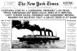 This warning was printed adjacent to an advertisement for Lusitania's return voyage which led to many interpreting this as a direct message to the Lusitania.[64](p2) The ship departed Pier 54 in New York, on 1 May 1915 at 12:20 pm, on what would be her final voyage.[65][66] A few hours after the vessel's departure, the Saturday evening edition of The Washington Times published two articles on its front page, both referring to those warnings.[67]