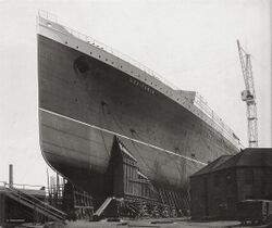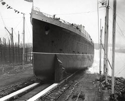 The shipyard at John Brown had to be reorganised because of her size so that she could be launched diagonally across the widest available part of the river Clyde where it met a tributary, the ordinary width of the river being only 610 feet (190 m) compared to the 786-foot (240 m) long ship. The new slipway took up the space of two existing ones and was built on reinforcing piles driven deeply into the ground to ensure it could take the temporary concentrated weight of the whole ship as it slid into the water. In addition, the company spent £8,000 to dredge the Clyde, £6,500 on new gas plant, £6,500 on a new electrical plant, £18,000 to extend the dock and £19,000 for a new crane capable of lifting 150 tons as well as £20,000 on additional machinery and equipment.[29] Construction commenced at the bow working backwards, rather than the traditional approach of building both ends towards the middle. This was because designs for the stern and engine layout were not finalised when construction commenced. Railway tracks were laid alongside the ship and across deck plating to bring materials as required. The hull, completed to the level of the main deck but not fitted with equipment weighed approximately 16,000 tons.[30]