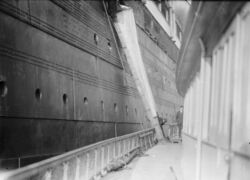 The vessels of the Olympic class also differed from Lusitania and Mauretania in the way in which they were compartmented below the waterline. The White Star vessels were divided by transverse watertight bulkheads. While Lusitania also had transverse bulkheads, it also had longitudinal bulkheads running along the ship on each side, between the boiler and engine rooms and the coal bunkers on the outside of the vessel. The British commission that had investigated the sinking of Titanic in 1912 heard testimony on the flooding of coal bunkers lying outside longitudinal bulkheads. Being of considerable length, when flooded, these could increase the ship's list and "make the lowering of the boats on the other side impracticable"[39]—and this was precisely what later happened with Lusitania. The ship's stability was insufficient for the bulkhead arrangement used: flooding of only three coal bunkers on one side could result in negative metacentric height.[40] On the other hand, Titanic was given ample stability and sank with only a few degrees list, the design being such that there was very little risk of unequal flooding and possible capsize.[41]