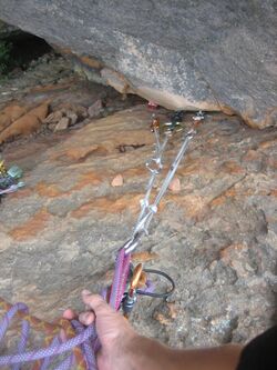 A sling or runner is an item of climbing equipment consisting of a tied or sewn loop of webbing. These can be wrapped around sections of rock, hitched to other pieces of equipment, or tied directly to a tensioned line using a Prusik style knot. They may be used as anchors, to extend an anchor to reduce rope drag, in anchor equalization, or to climb a rope.[1]