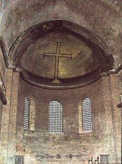 Influences from Byzantine architecture, particularly in religious buildings, can be found in diverse regions from Egypt and Arabia to Russia and Romania. Byzantine architecture is known for the use of domes, and pendentive architecture was invented in the Byzantine Empire. In contrast to the basilica plans favored in medieval western European churches, Byzantine churches usually had more centralized ground plans, such as the cross-in-square plan deployed in many Middle Byzantine churches.[150] It also often featured marble columns, coffered ceilings and sumptuous decoration, including the extensive use of mosaics with golden backgrounds. Byzantine architects used marble mostly as interior cladding, in contrast to the structural roles it had for the Ancient Greeks. They used mostly stone and brick, and also thin alabaster sheets for windows. Mosaics were used to cover brick walls, and any other surface where fresco would not resist. Good examples of mosaics from the proto-Byzantine era are in Hagios Demetrios in Thessaloniki (Greece), the Basilica of Sant'Apollinare Nuovo and the Basilica of San Vitale, both in Ravenna (Italy), and Hagia Sophia in Istanbul. Christian liturgies were held in the interior of the churches, the exterior usually having little to no ornamentation.[151][152]
