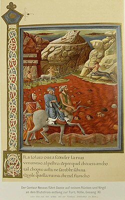 The most well-known part of Dante's epic poem due to its intense and imaginative imagery. There are 9 circles of hell, often grouped into three perversions of love.[7] Violence is split to an additional 3 and fraud has an additional 10. Dante obviously had a very special place in hell for fraud. Interestingly, Dante often includes Roman mythological creatures, contemporary Italian figures (several of which Dante had met himself), and Biblical figures throughout Hell.