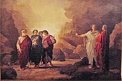 - First Circle: Limbo, or the abyss. The place for the unbaptized and virtuous pagans, for those who could not choose God but choose human virtue.[8] It is abode of famous Roman figures, Greek figures and Greek mythological heroes who had the misfortunate of being born in the wrong time period. The Muslim general Saladin is there for having shown mercy in combat. It formerly housed some righteous Jews from the Old Testament, like Noah and Moses, who were born before the New Testament, but, after his crucifixion, Jesus descended into Limbo and took them into Heaven in an event known as the Harrowing of Hell.