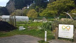An urban farm called Kaicycle in the capital city Wellington was established in 2015. It started as a way of composting local food waste, food scraps are collected by bicycle. Their criteria includes organic waste of up to 60 litres per week from local households and business. Their purpose is "diverting food waste from landfill and recycling these nutrients back into local soils". They garden on their urban farm with the compost they make and invite volunteers to help regularly. They sell some of the produce which helps pay for the composting operations, they also share it with volunteers and donate to community food projects.[132][133][134] In 2020 it joined a new network of composting hubs managed by the Sustainability Trust.[135]