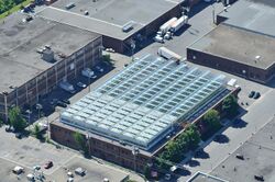 Canada has a number of companies working on urban farm technology, including in Montreal. The most significant is Lufa Farms, a private company that opened what is reported to be the world's largest rooftop greenhouse at 163,000 sq ft in the Montreal borough of Saint-Laurent.[107] This is Lufa's fourth rooftop greenhouse in Montreal and is built on the roof of the former Sears Canada warehouse.[108] Lufa's first rooftop greenhouse was built in early 2011, a 2880 sq metre (31,000 sq ft) hydroponic rooftop greenhouse atop a warehouse designated as their headquarters.[109][110] They built two more large rooftop greenhouses in greater Montreal in 2013 (4,000 sq metre / 43,000 sq ft) and 2017 (5,850 sq metre / 63,000 sq ft), spending almost $10 million for the three structures.[111] Also in 2017, an IGA supermarket in Saint-Laurent in Montreal unveiled a green roof of about 25,000 square feet of green space and products certified by Ecocert Canada. They state that they can provide over 30 different kinds of rooftop grown organic produce, along with honey produced and harvested from eight bee hives located on the roof.[112]