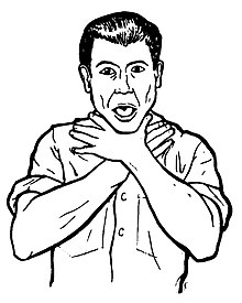 Choking is when the airway gets blocked such that a person is unable to breathe.[4] Symptoms may include sudden onset of drooling, coughing, wheezing, stridor, shortness of breath, or holding both hands around the front of the throat.[2][3][1] People with mild choking can usually speak or cry while those with severe disease cannot.[4] Without help unconsciousness and death may occur.[4][3]