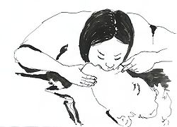 In one of the most depicted, the rescuer sits down on a seat with the baby, and supports the baby with a forearm and its respective hand. The baby's head must be carefully held with that hand, usually by the jaw. Then the baby's body can be leaned forward upside-down along the rescuer's thighs and receive the slaps.