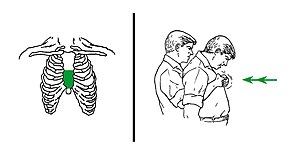 Abdominal thrusts (Heimlich maneuver)[21] are performed with the rescuer standing behind the choking person. The rescuer closes the own dominant hand, grasps it with the other hand, and presses forcefully inwards and upwards with both hands on the area located between the chest and the belly button of the person. The pressure is not focused directly against the ribs to avoid breaking them. If the first thrust does not solve the choking, it can be repeated several times.
