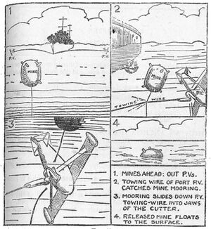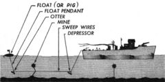 The majority of mines left by the Japanese in the Pacific were contact mines which were usually moored and could be removed by a paravane. The Japanese never created their own magnetic or pressure mines, though they captured a very limited number of magnetic mines from the British which they laid off Balikpapan in 1945. Magnetic mines in the European theater were usually disabled by towing a magnetized cable, often swept by wooden-hulled ships, but occasionally swept by iron-clad ships that were degaussed to mask their magnetic properties. Minesweeping in the Pacific theater in World War II consisted primarily in the use of sweep wires suspended between paravanes and kites, particularly among destroyer minesweepers.[1]