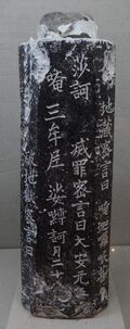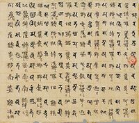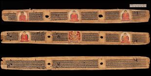 The role of dharanis in Buddhist practice of mid-1st-millennium CE is illustrated by numerous texts including the systematic treatises that emerged. According to Paul Copp, one of the earliest attestable literary mandate about writing dharanis as an effective spell in itself is found in a Chinese text dated between 317 and 420 CE.[48] This text is the Qifo bapusa suoshuo da tuoluoni shenzhou jing (or, Great Dharani Spirit-Spell Scripture Spoken by the Seven Buddhas and Eight Bodhisattvas).[48]The Collected Dhāraṇī Sūtras, for example, were compiled in the mid-seventh century.[49] Some of the oldest Buddhist religious inscriptions in Stupas (Dagoba, Chörten) are extracts from dharani-genre compositions such as the Bodhigarbhalankaralaksa-dharani.[50][51][note 2] Manuscript fragments of Sumukha-dharani discovered in Central Asia and now held at the Leningrad Branch of Russian Academy of Sciences are in the Sanskrit language and the Brahmi script, a script that was prevalent before the early centuries of the common era.[53]