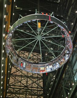 The S-IB stage was built by the Chrysler corporation at the Michoud Assembly Facility, New Orleans.[5] It was powered by eight Rocketdyne H-1 rocket engines burning RP-1 fuel with liquid oxygen (LOX). Eight Redstone tanks (four holding fuel and four holding LOX) were clustered around a Jupiter rocket LOX tank, which earned the rocket the nickname "Cluster's Last Stand".[6] The four outboard engines were mounted on gimbals, allowing them to be steered to control the rocket. Eight fins surrounding the base thrust structure provided aerodynamic stability and control.