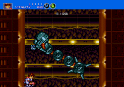The team approached Gunstar Heroes with an "anything goes" concept, that led to many ambitious ideas being implemented into the final game.[7][8] One such concept was the weapon combination mechanic, which was conceived in the early planning stages.[10] They experimented with weapon attributes until the end of development,[10] and designed the game so players would continue discovering new weapons and devise new ways to complete stages.[7] The processor also made articulated multi-limb enemies possible, like the boss "Seven Force," which was programmed by Nami along with all other bosses.[8] Because moving around large sprites was difficult due to limited video RAM, Seven Force was built by combining circles and squares to make one large character.[8] Maegawa claims the game could have never worked on the Super NES because the boss animations required expanded computing power.[9] The standard enemy characters, designed by Han, were drawn on the screen by combining a top and bottom sprite, allowing for more animation patterns with lower memory usage.[8] Han was inspired by the game Mazin Saga (1993) to program the enemies manually rather than with mathematical algorithms.[12] The game was 16 megabits but compressed to fit under 8.[9]