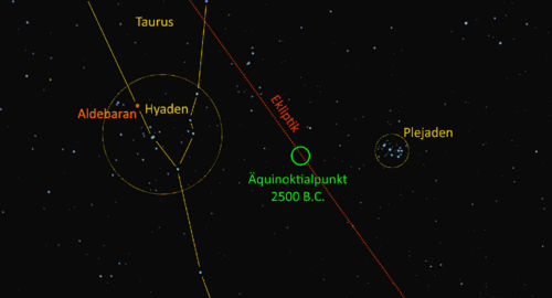 From 4000 to 1500 BC the equinox was within the constellation Taurus, and therefore, this constellation was attached great importance.[2] The 4500 year old sky tablet of the neolithic Tal-Qadi Temple in Malta is thought to display the Golden Gate of the Ecliptic.[3]