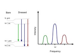From these two functions it is easy to see that in the weak field limit a single peak appears at [math]\displaystyle{ \omega_{0} }[/math] in the spectral density due to the delta function, while in the strong field limit a Mollow triplet forms with sideband peaks at [math]\displaystyle{ \omega = \omega_{0} \pm \Omega_{R} }[/math], and appropriate peak width of [math]\displaystyle{ \frac{\Gamma}{2} }[/math] for the central peak and [math]\displaystyle{ \frac{3\Gamma}{4} }[/math] for the sideband peaks.