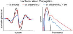 Because of their relatively high amplitude to wavelength ratio, ultrasonic waves commonly display nonlinear propagation behavior. For example, nonlinear acoustics is a field of interest for medical ultrasonography because it can be exploited to produce better image quality.