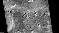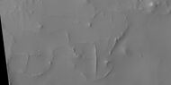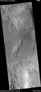 Arabia contains many interesting features. There are some good examples of pedestal craters in the area. A pedestal crater has its ejecta above the surrounding terrain, often forming a steep cliff. The ejecta forms a resistant layer that protects the underlying material from erosion.[2] Mounds and buttes on the floor of some craters display many layers. The layers may have formed by volcanic processes, by wind, or by underwater deposition.[3][4] Dark slope streaks have been observed in Tikhonravov Basin, a large eroded crater. The streaks appear on steep slopes and change over time. At first they are dark, then turn a lighter color, probably by the deposition of fine, light colored dust from the atmosphere.[5] These streaks are thought to form by dust moving downslope in a way similar to snow avalanches on Earth.[6]