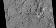 Arrows point to possible pingos, as seen by HiRISE under HiWish program Pingos contain a core of pure ice.