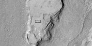 Enlarged view of a part of previous image, as seen by HiRISE under HiWish program. The rectangle represents the size of a football field.