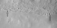 Close view of mantle, as seen by HiRISE under HiWish program Arrows show craters along edge which highlight the thickness of mantle.