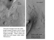 Layers in Tikonravev Crater in Arabia, as seen by Mars Global Surveyor (MGS). Layers may form from volcanoes, the wind, or by deposition under water. The craters on the left are pedestal craters. Some researchers believe this crater once held a massive lake.