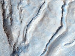 Many places on Mars show channels of different sizes. Many of these channels probably carried water, at least for a time. One study that used HiRISE pictures found over 17,000 km of ancient river valleys in Arabia Terra.[18][19] Many ancient river valleys have been determined to be relatively recent, according to research published in 2016 in the Journal of Geophysical Research: Planets. These valleys carried water into lake basins. One lake, nicknamed "Heart Lake," had a volume similar to Lake Ontario.[20][21] The climate of Mars may have been such in the past that water ran on its surface. It has been known for some time that Mars undergoes many large changes in its tilt or obliquity because its two small moons lack the gravity to stabilize it, as the Moon stabilizes Earth; at times the tilt has even been greater than 80 degrees[22][23]