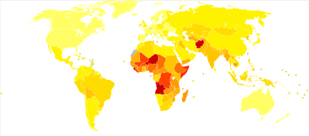 In 2008, pneumonia occurred in approximately 156 million children (151 million in the developing world and 5 million in the developed world).[3] It caused 1.6 million deaths or 28–34% of all deaths in those under five years of age of which 95% occurred in the developing world.[3][13] Out of all deaths of children age five and under in 2017, pneumonia was the cause of 15%, killing more children than any other infectious disease.[7] Countries with the greatest burden of disease include: India (43 million), China (21 million) and Pakistan (10 million).[14]