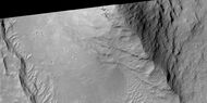 Parts of the Aeolis quadrangle contain fretted terrain which is characterized by cliffs, mesas, buttes, and straight-walled canyons. It contains scarps or cliffs that are 1 to 2 km in height.[183][184]