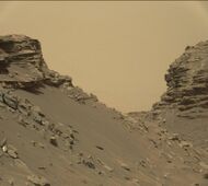 View from Mastcam on Curiosity showing sloping buttes and layered outcrops on lower Mount Sharp