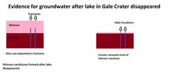 A large group of researchers discovered halos around fractures that they water existed in the ground long after water disappeared from Gale crater. Groundwater, carrying dissolved silica, moved in fractures and deposited silica there. This silica enrichment went across young and old rocks.[155][156]