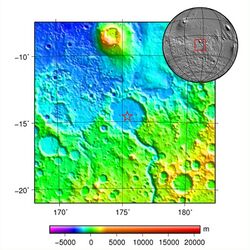 From Handwiki ![]() Map of Aeolis quadrangle from Mars Orbiter Laser Altimeter (MOLA) data. The highest elevations are red and the lowest are blue. The Spirit rover landed in Gusev crater. Aeolis Mons is in Gale Crater. | |