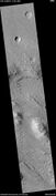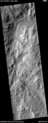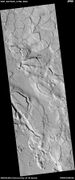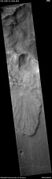 Yardangs are another feature found in this quadrangle. They are generally visible as a series of parallel linear ridges, caused by the direction of the prevailing wind.