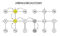 CBCA(CO)NH, or alternatively HN(CO)CACB, correlates the resonances of the amide of a residue with the Cα and Cβ of the preceding residue.[11] Two peaks corresponding to the Cα and Cβ are therefore visible for each residue. This experiment is normally used together with HNCACB. The sidechain carboxamide of glutamines and asparagines also appear in this spectra in this experiment. CBCA(CO)NH is sometimes more precisely called (HBHA)CBCA(CO)NH as it starts with aliphatic protons and ends on an amide proton, and is therefore not an out-and-back experiment like HN(CO)CACB.
