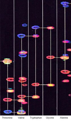 Pairs of experiments are normally used for sequential assignment, for example, the HNCACB and CBCA(CO)NH pair, or HNCA and HNC(CO)CA. The spectra are normally analyzed as strips of peaks, and strips from the pair of experiments may be presented together side by side or as an overlay of two spectra. In the HNCACB spectra 4 peaks are usually present in each strip, the Cα and Cβ of one residue as well as those of its preceding residue. The peaks from the preceding residue can be identified from the CBCA(CO)NH experiment. Each strip of peaks can therefore be linked to the next strip of peaks from an adjoining residue, allowing the strips to be connected sequentially. The residue type can be identified from the chemical shifts of the peaks, some, such as serine, threonine, glycine and alanine, are much easier to identify than others. The resonances can then be assigned by comparing the sequence of peaks with the amino acid sequence of the protein.