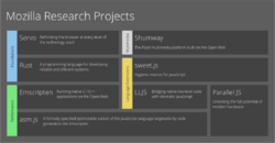 Discontinued projects are in italics. Some projects abandoned by Mozilla that are still maintained by third parties are in bold. |