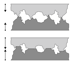 Static friction is friction between two or more solid objects that are not moving relative to each other. For example, static friction can prevent an object from sliding down a sloped surface. The coefficient of static friction, typically denoted as μs, is usually higher than the coefficient of kinetic friction. Static friction is considered to arise as the result of surface roughness features across multiple length scales at solid surfaces. These features, known as asperities are present down to nano-scale dimensions and result in true solid to solid contact existing only at a limited number of points accounting for only a fraction of the apparent or nominal contact area.[31] The linearity between applied load and true contact area, arising from asperity deformation, gives rise to the linearity between static frictional force and normal force, found for typical Amonton–Coulomb type friction.[32]