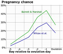 In women who have regular menstrual cycles, the fertile window occurs at approximately the same time every month. If the first day of menses is considered day 1, then ovulation occurs around day 14. In regular cycles that are 26–32 days long, the fertile window occurs on days 8–19.[9]