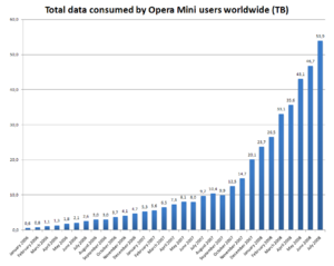 In July 2012, Opera Software reported that Opera Mini had 168.8 million users as of March 2012.[10] In February 2013, Opera reported 300 million unique Opera Mini active users and 150 billion page views served during that month. This represented an increase of 25 million users from September 2012.[11]